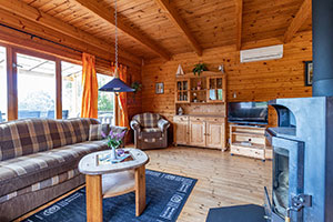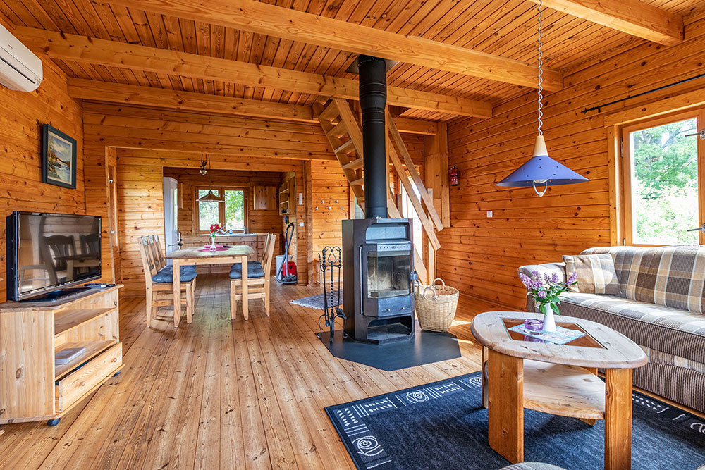 Im Erdgeschoss sind die Küche und das Bad mit Dusche und WC, sowie der geräumige Wohn- und Essplatzbereich untergebracht. Die Ausstattung der Küche umfasst unter anderem einen Gasherd mit Backofen, eine Kühlgefrierkombination, eine Mikrowelle, Wasserkocher, Toaster und Kaffeemaschine. Im Wohnbereich gibt es eine gemütliche 3-2-1 Sitzgruppe, einen Kaminofen, der an nicht ganz so schönen Tagen für behagliche Wärme im Haus sorgt und deutschsprachiges Sat-TV+Radio.
